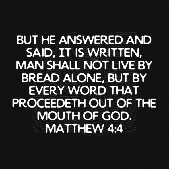 Man Shall Not Live by Bread Alone Posted on January 10, 2020 by Guylaine S Gamble www.bible.com/1/mat.4.4.kjv Share this: Share on Facebook (Opens in new window) Facebook Share on X (Opens in new window) X Share on Pinterest (Opens in new window) Pinterest Share on LinkedIn (Opens in new window) LinkedIn More Email a link to a friend (Opens in new window) Email Share on Tumblr (Opens in new window) Tumblr Share on Reddit (Opens in new window) Reddit Share on Pocket (Opens in new window) Pocket Print (Opens in new window) Print Like Loading... Related