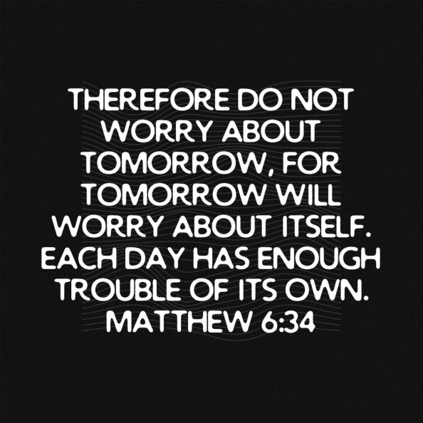 Do Not Worry About Tomorrow Posted on January 30, 2020 by Guylaine S Gamble www.bible.com/111/mat.6.34.niv Share this: Click to share on Facebook (Opens in new window) Facebook Click to share on X (Opens in new window) X Click to share on Pinterest (Opens in new window) Pinterest Click to share on LinkedIn (Opens in new window) LinkedIn More Click to email a link to a friend (Opens in new window) Email Click to share on Tumblr (Opens in new window) Tumblr Click to share on Reddit (Opens in new window) Reddit Click to share on Pocket (Opens in new window) Pocket Click to print (Opens in new window) Print Like Loading... Related