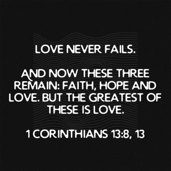 Love Never Fails Posted on February 15, 2020 by Guylaine S Gamble www.bible.com/111/1co.13.8,13.niv Share this: Share on Facebook (Opens in new window) Facebook Share on X (Opens in new window) X Share on Pinterest (Opens in new window) Pinterest Share on LinkedIn (Opens in new window) LinkedIn More Email a link to a friend (Opens in new window) Email Share on Tumblr (Opens in new window) Tumblr Share on Reddit (Opens in new window) Reddit Share on Pocket (Opens in new window) Pocket Print (Opens in new window) Print Like Loading... Related