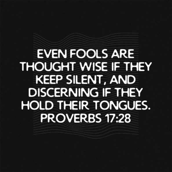 Keep Silent Posted on May 17, 2020 by Guylaine S Gamble www.bible.com/111/pro.17.28.niv Share this: Click to share on Facebook (Opens in new window) Facebook Click to share on X (Opens in new window) X Click to share on Pinterest (Opens in new window) Pinterest Click to share on LinkedIn (Opens in new window) LinkedIn More Click to email a link to a friend (Opens in new window) Email Click to share on Tumblr (Opens in new window) Tumblr Click to share on Reddit (Opens in new window) Reddit Click to share on Pocket (Opens in new window) Pocket Click to print (Opens in new window) Print Like Loading... Related