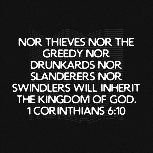 Thieves, Greedy, Drunkards, Slanderers and Swindlers Posted on August 24, 2020 by Guylaine S Gamble www.bible.com/111/1co.6.10.niv Share this: Share on Facebook (Opens in new window) Facebook Share on X (Opens in new window) X Share on Pinterest (Opens in new window) Pinterest Share on LinkedIn (Opens in new window) LinkedIn More Email a link to a friend (Opens in new window) Email Share on Tumblr (Opens in new window) Tumblr Share on Reddit (Opens in new window) Reddit Print (Opens in new window) Print Like Loading... Related