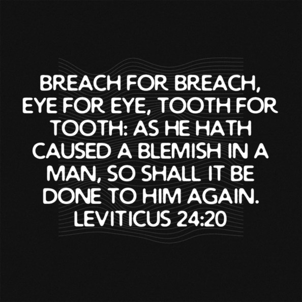 Eye for eye Posted on September 22, 2020 by Guylaine S Gamble www.bible.com/1/lev.24.20.kjv Share this: Share on Facebook (Opens in new window) Facebook Share on X (Opens in new window) X Share on Pinterest (Opens in new window) Pinterest Share on LinkedIn (Opens in new window) LinkedIn More Email a link to a friend (Opens in new window) Email Share on Tumblr (Opens in new window) Tumblr Share on Reddit (Opens in new window) Reddit Print (Opens in new window) Print Like Loading... Related